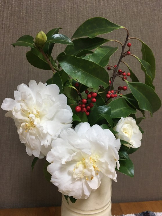 まだ蕾の椿、白い山茶花、そして縁起の良い千両と、色とりどりで目を癒してくれます。