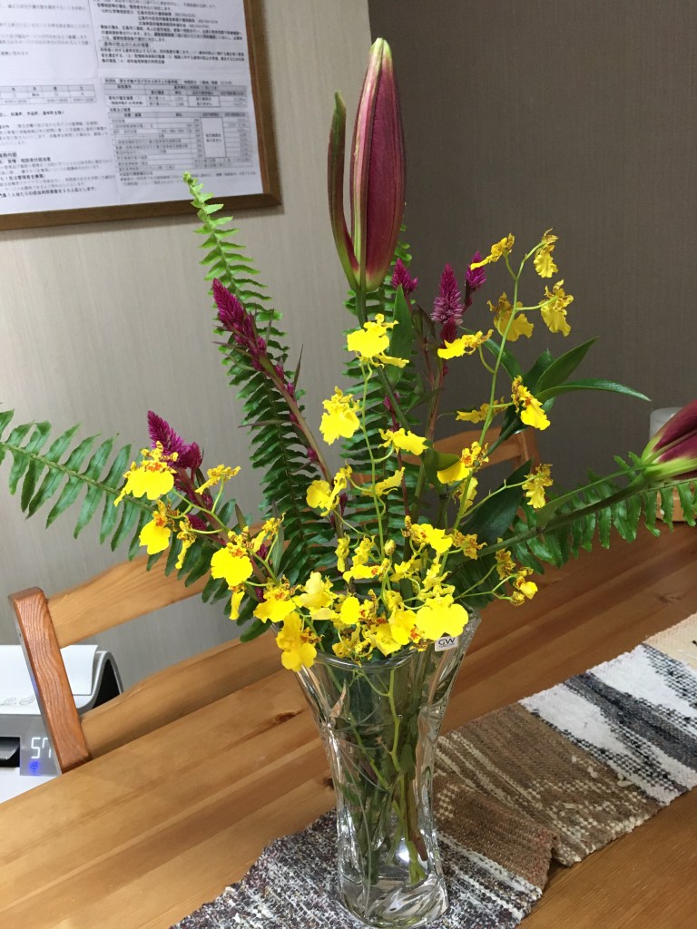 オリエンタルリリー、オンシジウム、ケイトウで生けてみました。