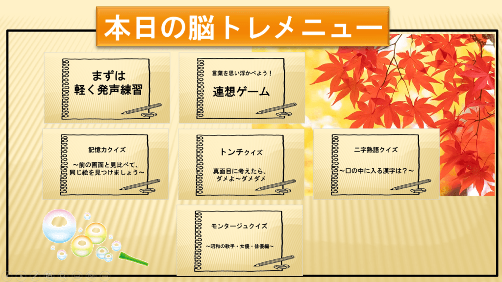 ライフ・ネセサリー株式会社 ケアプランセンター柚李(ゆずき) 脳トレ 集会所 レクリエーション 歌と脳トレ モンタージュクイズ 同じもの探し 連想ゲーム